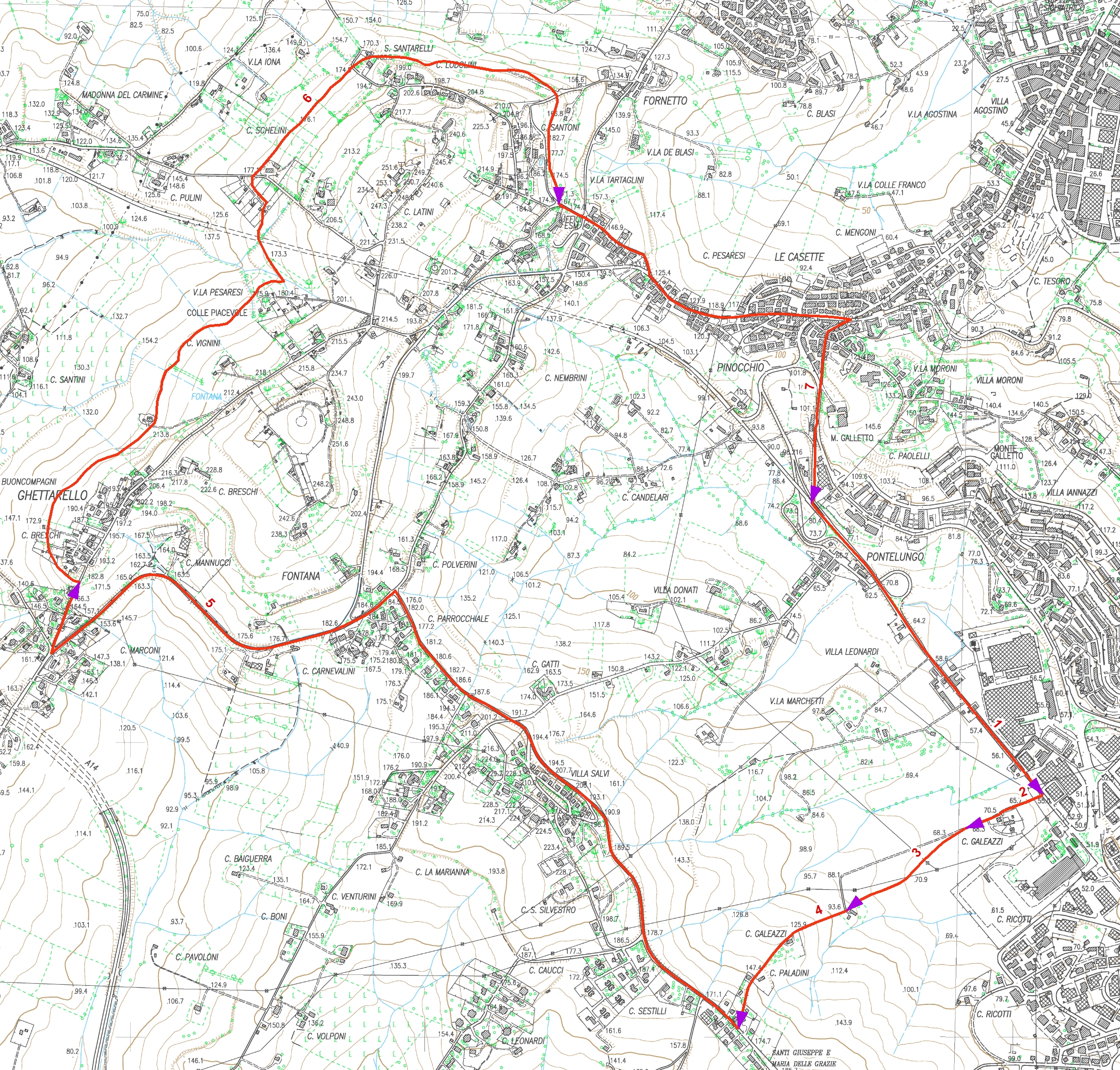 prosegue sulla stessa strada fino all’innesto con la strada provinciale n. 6 fino alla casa Marconi, per proseguire verso nord per m. 250 circa fino ad incontrare la curva di livello quota 175 |